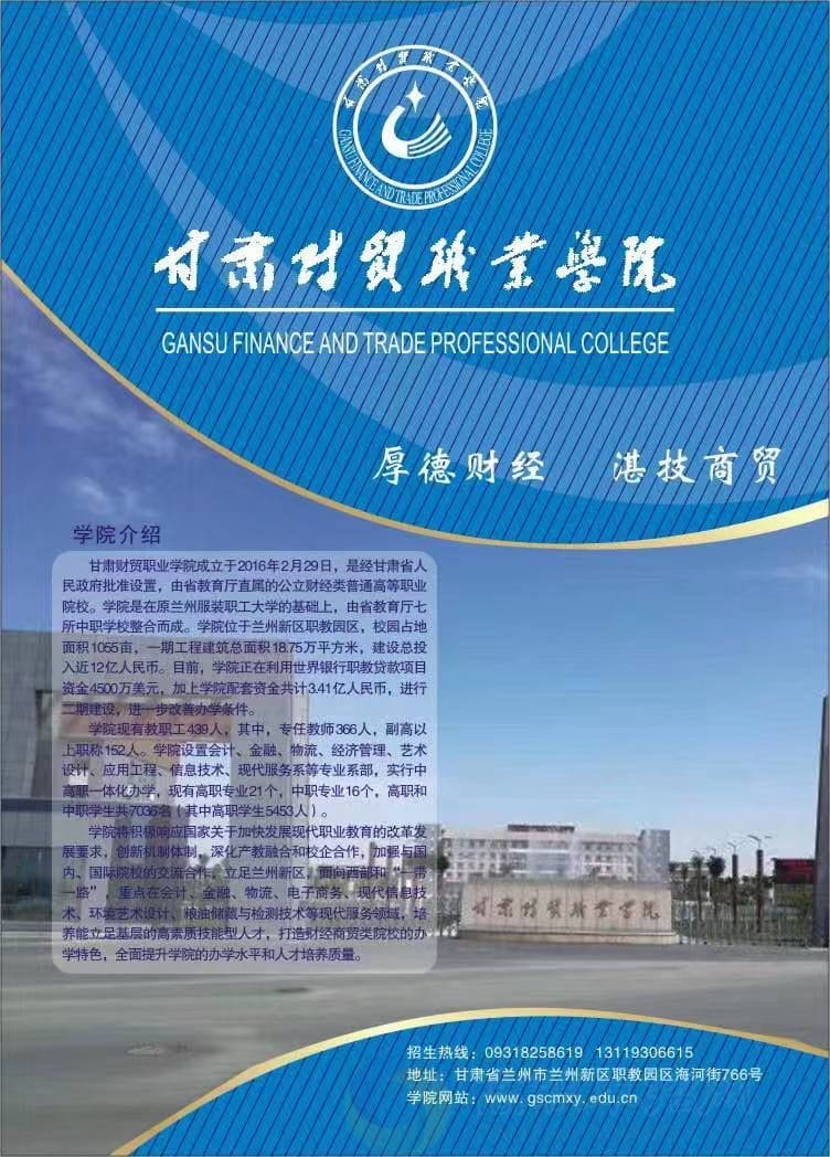 甘肃财贸职业学院于2016年2月29日经甘肃省人民政府批准设置,由省政府举办,隶属于省教育厅,是全省唯一一所公立财经类普通高等职业学校。学院是在原兰州服装职工大学的基础上,由甘肃银行学校、甘肃省经济学校、甘肃省财贸学校、甘肃省经贸学校、甘肃省商业学校、甘肃省工商行政管理学校、甘肃省艺术设计学校等七所省教育厅直属学校整合而成。